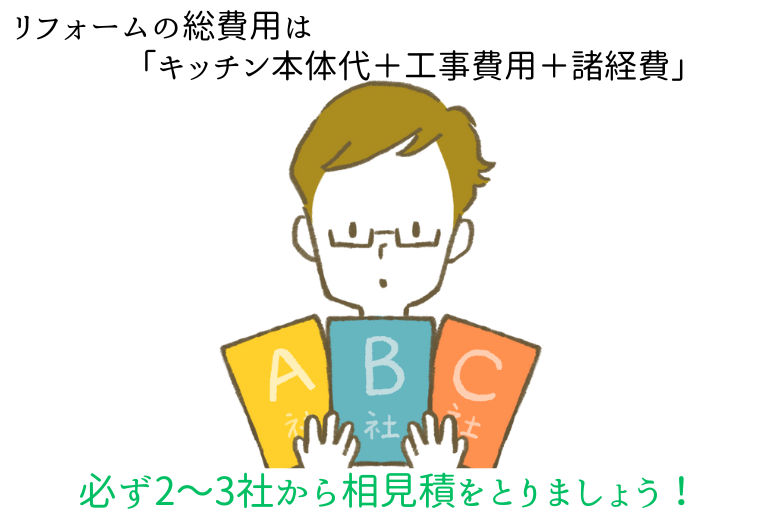 リフォーム費用は「キッチン本体代+工事費用+諸経費」で決まります。ですから、必ず総合計で比較することが大切です。